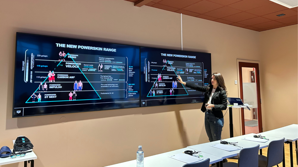 Arena Academy er det offisielle opplæringsprogrammet vårt, utviklet for å utdanne ulike målgrupper om våre teknologier, produkter og verdier. Vi starter vanligvis med en kort introduksjon før vi går rett over til praktisk læring. Ofte inkluderer vi en økt i svømmehallen der utøvere kommer ned på bassengkanten, tester konkurransedrakter, svømmebriller og treningsutstyr, og deler tilbakemeldingene sine, sier Maria Maurizi.