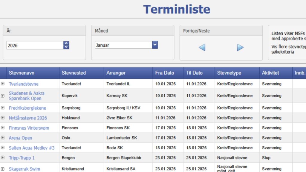 Fristen for å registrere svømmestevner til terminlisten 2026 gikk ut 1.september.