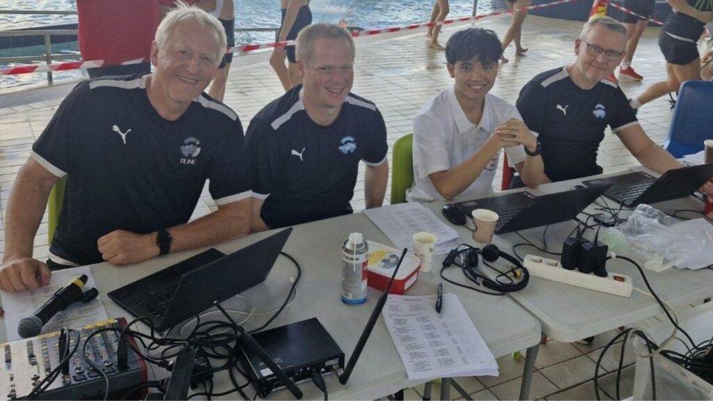 Fra venstre, Rune Larsen (speaker), Håkon Strandenes Sjef elektronikken), Don Vo (tidtakersjef) og Inge Skuseth (opplæring elektronikken)