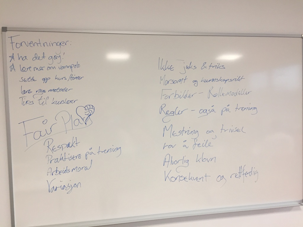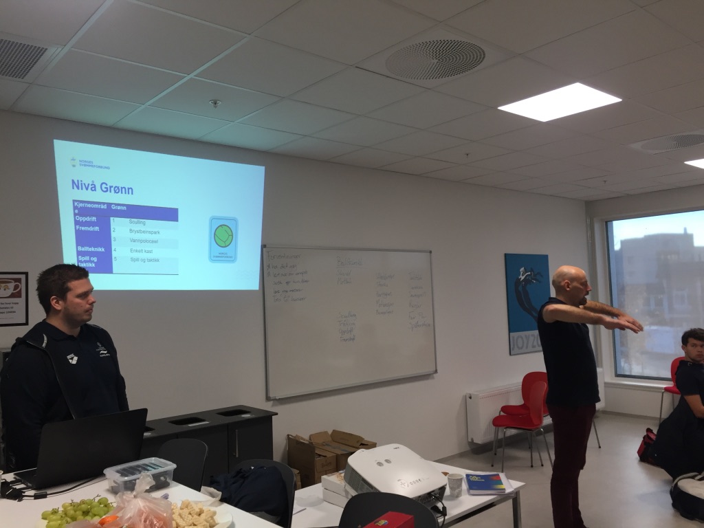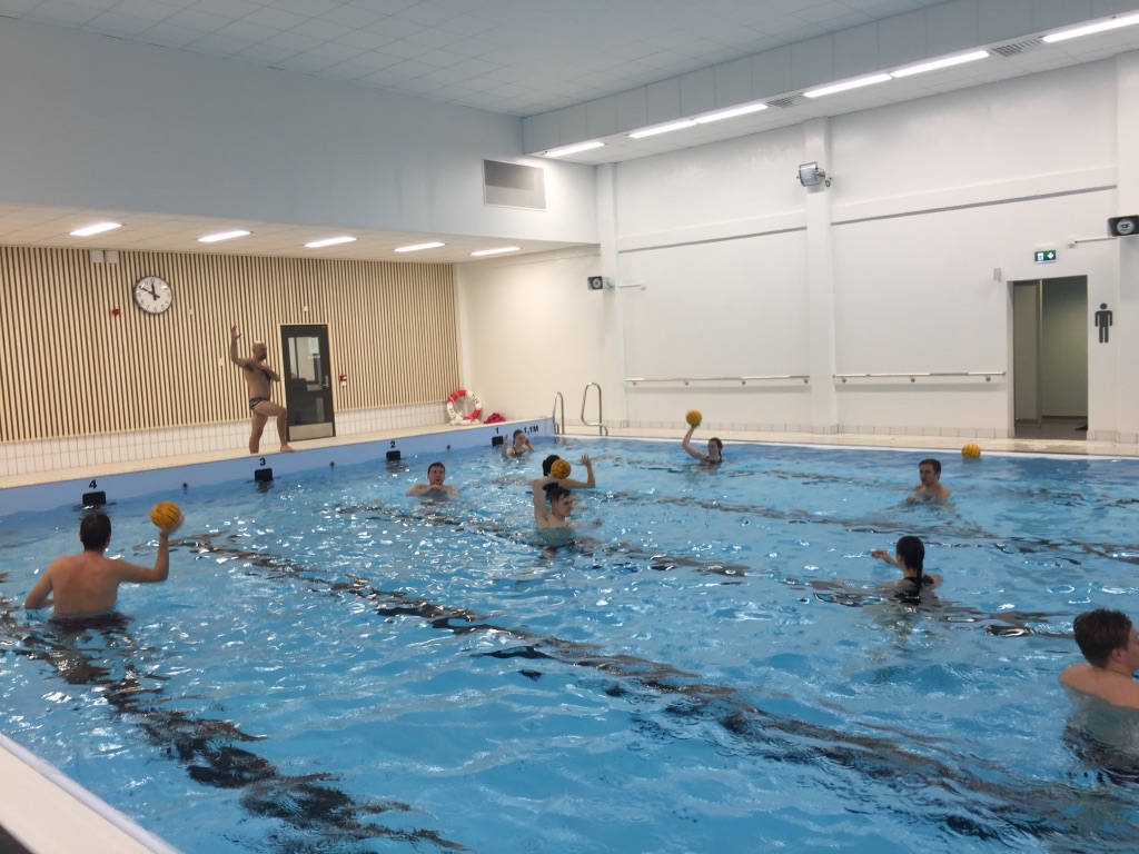 Det var mye tid i vann med og uten ball. Deltakerne fikk prøve øvelsene på de fire nivåene (grønn, blå, rød og svart), og de fikk prøve seg på å planlegge trening, og lære bort dette på de andre deltakerne.